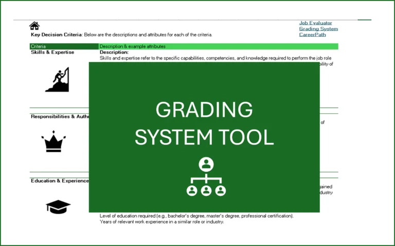 Easy to use grading system tool that can help with the evaluation of your jobs across factors and having such jobs mapped to appropriate grade levels within your organisation. The tool is adjustable and is 100% editable.